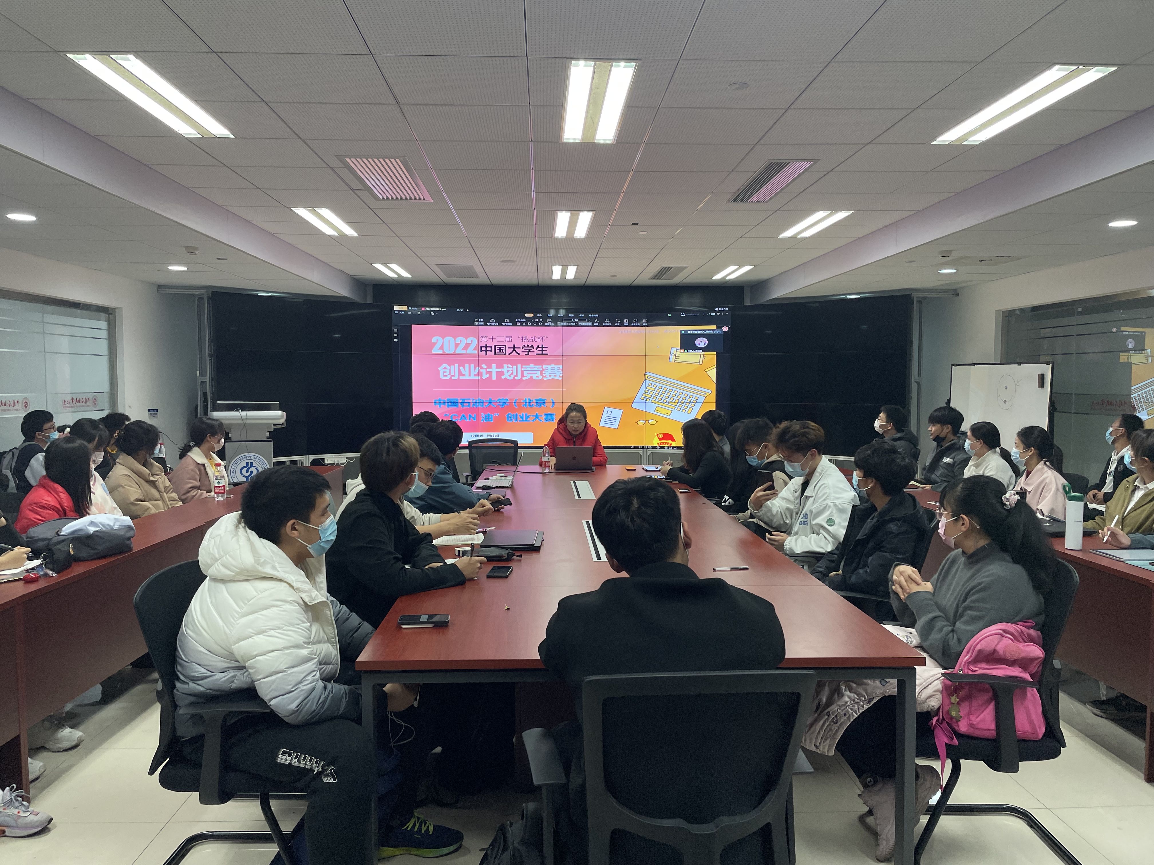 贾庆超老师分别对“CAN 油”创业大赛来历、评选流程、参赛题目选择技巧等进行了详细介绍;并结合往年获奖队伍情况,给参赛队伍进行了指导。