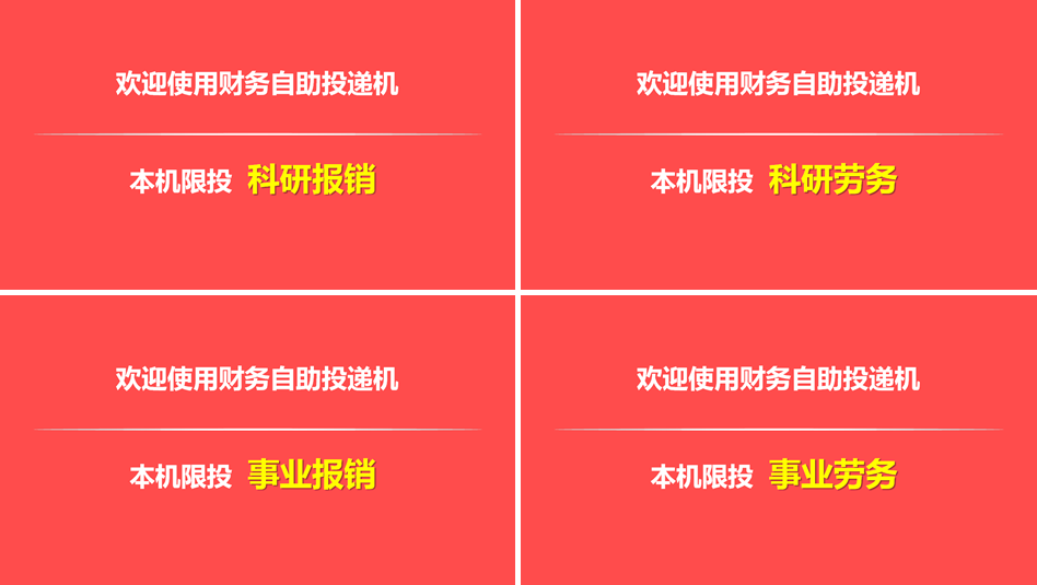 自助投递机安装地点设置在主楼B座双进门间西侧,共计四台投递机,投递分类为科研报销、科研劳务、事业报销、事业劳务。每台投递机设有上、下两个显示屏幕,上屏幕为宣传提示屏,下屏幕为触摸操作屏。