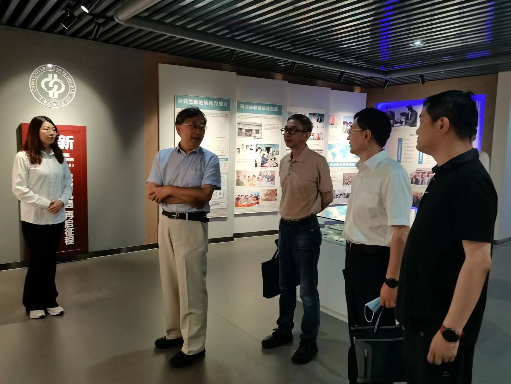 7月26日上午,中国华油集团副总经理周旭一行4人,在中石大地层微生物资源与应用研究中心副主任万云洋陪同下参观了校史馆。