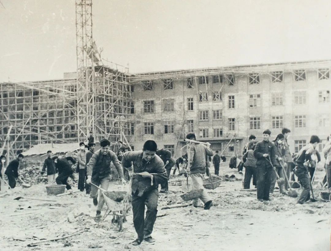 在艰苦的盐碱滩环境中,师生发扬艰苦奋斗的优良传统,凭借着自力更生、艰苦创业的精神亲手盖建“干打垒”住宅,种水稻、修水渠、并完成修路、植树等多项劳动,在荒野中建设起美丽的校园。
