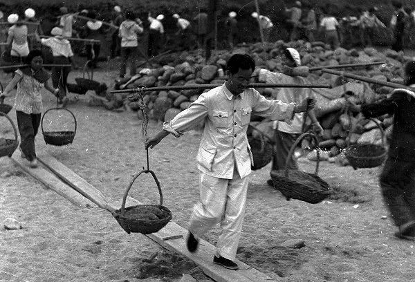 1958 年5月,北京石油学院师生参加修建十三陵水库义务劳动,时任劳动总指挥贾皞在挑土