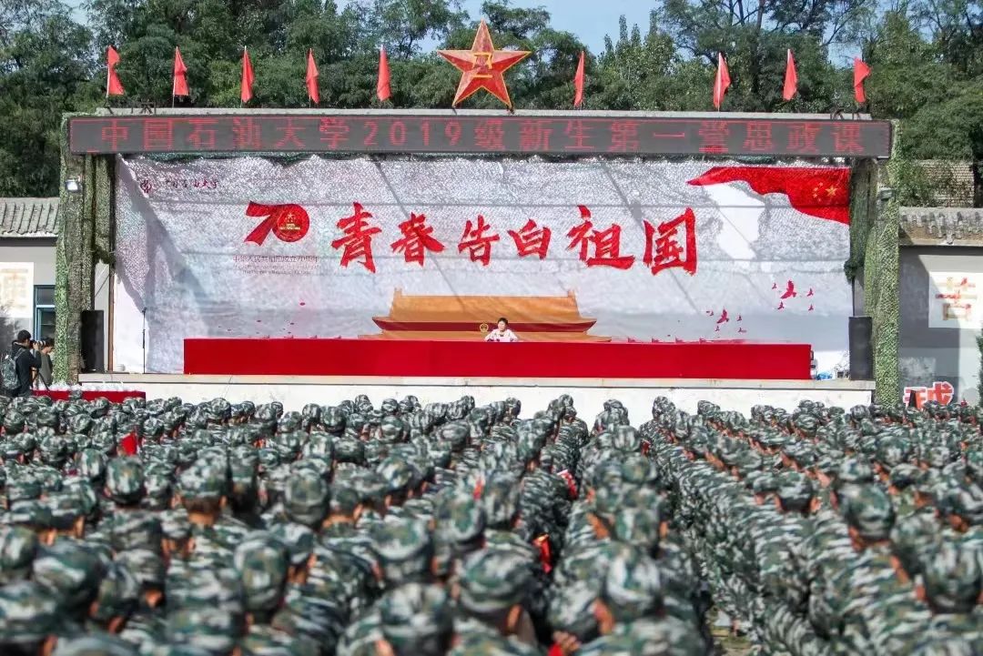 2019年,在喜迎新中国成立70周年之际,学校在平北军训基地举行“青春告白祖国”国旗下演讲活动,师生以实际行动深情告白伟大祖国,致敬伟大新时代。2021年10月10日,在克拉玛依校区的红旗操场上,参加军训的学生在成果汇演中通过变换动作一次摆出“100”、“党徽”、“国旗”等字样和图案,向建党百年献礼,每一个气势雄伟的动作,都表达着中石大人对祖国深沉的爱与祝福。