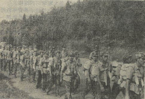 教师及1994级学生在军训拉练途中