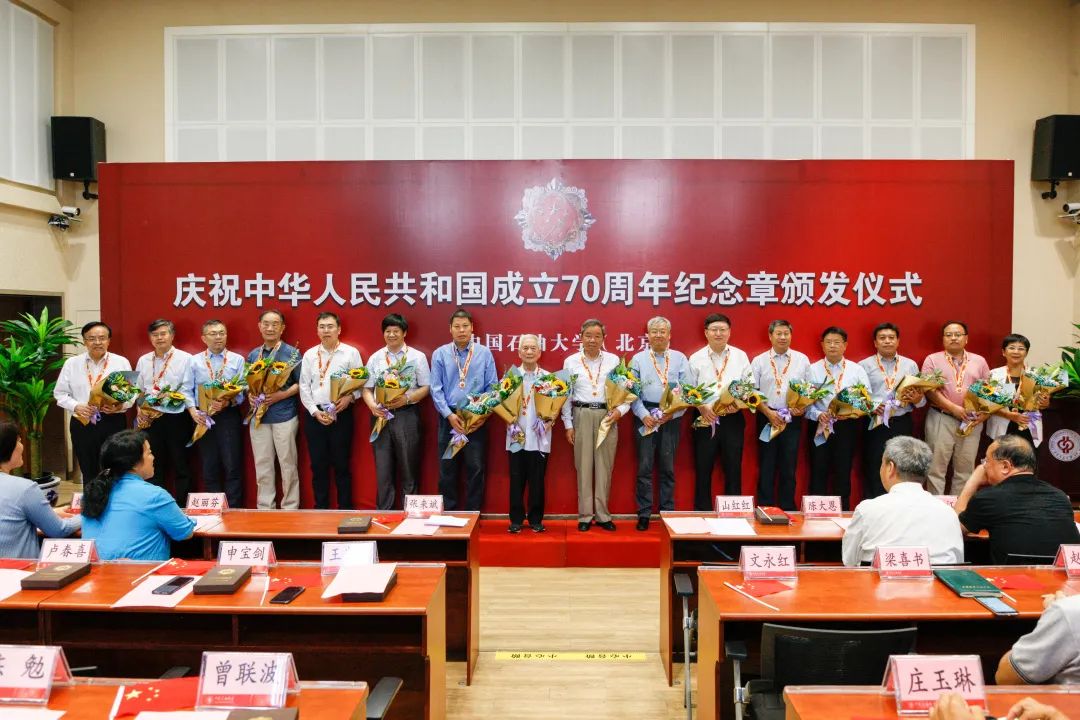 中华人民共和国成立70周年之际,中共中央、国务院、中央军委向中华人民共和国成立前参加工作的、健在的老战士老同志,中华人民共和国成立后获得国家级表彰奖励及以上荣誉并健在的人员等,颁发“庆祝中华人民共和国成立70周年”纪念章。中石大31位教职工荣获此项荣誉。9月20日,学校举行隆重的纪念章颁发仪式。在学校近70载的发展历程中,能源报国的精神流淌在中石大人的血脉里,获颁纪念章的教职工是中石大精神最忠实的传承者和弘扬者、最坚定的践行者和示范者,更是引领全校师生开拓进取、建功立业的榜样力量。