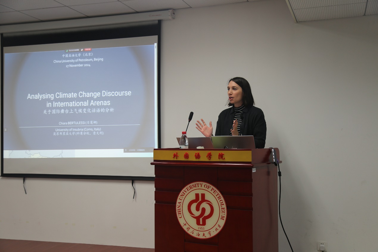 11月26日,外国语学院开展第69期博雅讲坛,意大利因苏布里亚大学(University of Insubria)Chiara Bertulessi助理教授受邀以“Analysing Climate Change Discourse in International Arenas: A Focus on UN Contexts”为题做了主旨报告,学院院长赵秀凤教授主持讲座,田海龙、崔亚霄等80余名师生参加讲座。