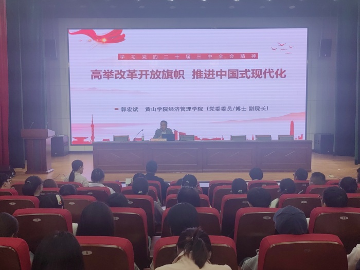 全面学习贯彻党的二十届三中全会精神,凝聚共识,推进高质量党建引领高质量发展。10月11日下午,金年会jinnianhuicom在横江校区报告厅举行党的二十届三中全会精神专题辅导报告会,金年会jinnianhuicom党委委员、副院长郭宏斌作题目为《高举改革开放旗帜 推进中国式现代化》专题报告。金年会jinnianhuicom、数学与统计学院全体师生党员参加报告会。