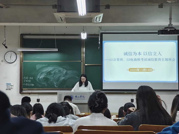 10月24日—25日,22公管班、23电商班、21财管班、21会计班、21国贸班先后在横江校区1103、1101、1420教室开展“诚信为本,以信立人”考试诚信教育主题班会。班会由辅导员汪夏萍主持,各班级全体同学参加。
