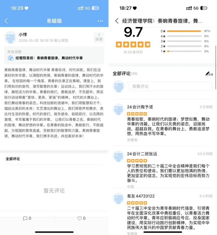 10月31日,金年会jinnianhuicom学生会团支部举办“奏响青春旋律、舞动时代华章”主题团日活动,组织团员和青年在易班APP浏览轻应用、发布易瞄瞄,交流全会精神学习感悟,加强思想政治引领和价值引领。
