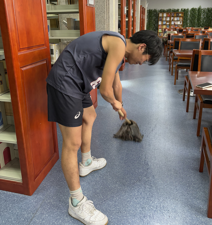 活动当日,同学们来到图书馆,在图书馆工作人员的引导下,大家迅速明确分工,有条不紊地开展清洁工作。有的同学手持扫帚,认真清扫地面的灰尘与杂物;有的同学拿着抹布,仔细擦拭书架、桌椅,不放过任何一个角落;还有的同学对书籍进行整理分类,将乱放的书籍归位,方便读者查找。尽管劳动任务繁重,但同学们热情高涨,以积极的态度投入到各项工作中。