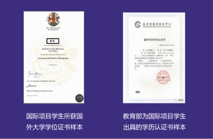 3+1项目为学生提供了国内3年的国际课程,可对接英国、美国、澳大利亚、加拿大、新西兰等13个国家的110余所大学,1年即可完成本科课程,并可连读1年制硕士课程。学生留学归国后,教育部留学服务中心对留学归国学生所获学士、硕士学位给予认证。