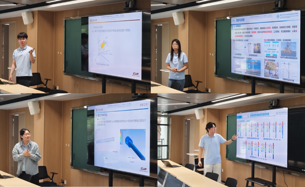派驻研究生刘文泽、李成刚、徐可奕、李浩泉、张雨凡、陈晓、李佳歆、李欣宬分别做《深海核电能源储存与补给系统耐压结构设计进展》《海洋钻井及钻完井工艺、浅水/深水采油树安装工具研究》《18-5/8寸BHT螺纹接头拉伸应力分析、水下管汇系统测试管道设计调研》《水下生产系统泄露风险与控油技术研究》《陆丰古近系岩石力学特性分析、地层大斜度井筒安全密度窗口预测研究》《基于安全屏障的超深水井喷风险防控研究》《井筒内岩屑运移规律及清洁工具研究》《深水双功能“三合一”浅层建井安装工具、深海高效环保膨胀型表层导管研究》主题汇报。