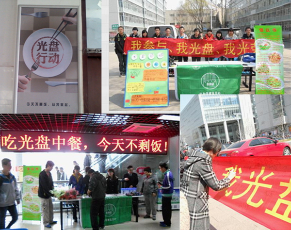 各食堂利用条幅、LED显示屏、桌面宣传画等方式向就餐师生倡导光盘行动,学生伙委会通过倡议书、条幅签名、发放调查问卷等方式在学生中宣传光盘行动的活动理念。为提高学生参与的积极性,第一食堂开展了评选“光盘之星”的活动,对在食堂用餐“光盘”的同学发放光盘之星卡片并加盖笑脸图章,对连续完成光盘任务的同学给予一定奖励。烛苑餐厅在就餐者点餐时会向其提出适量点餐的建议,并主动提供剩菜打包服务。