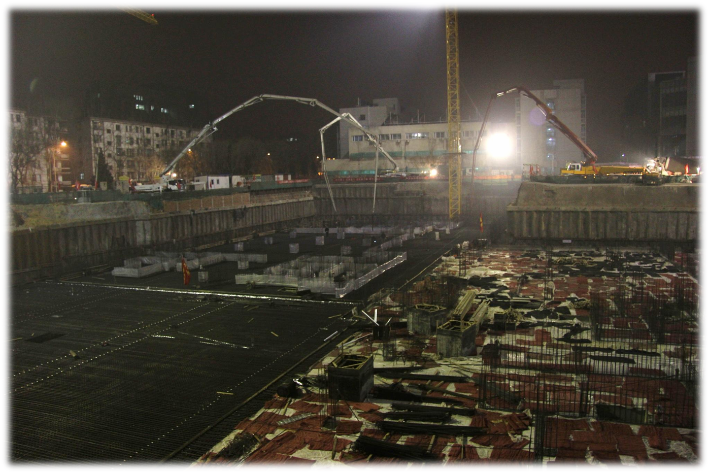 实验办公综合楼项目自2012年10月26日举行奠基典礼以来,参建各方共同努力,战严寒,斗风雪,克服极端严寒天气不利影响,历时95天,于2013年1月30日完成全部基础底板混凝土浇筑。至此,基础施工阶段的任务圆满完成,为确保60周年校庆前完成主体结构封顶的既定目标奠定了坚实的基础。实验办公综合楼基础底板面积约为8500平方米,基槽平均深度-9米,局部最深达-13米,施工完成土方开挖量9万余立方米,刚性桩基础施工756根,基础底板钢筋量约为1600余吨,浇筑混凝土量约为13000立方米。