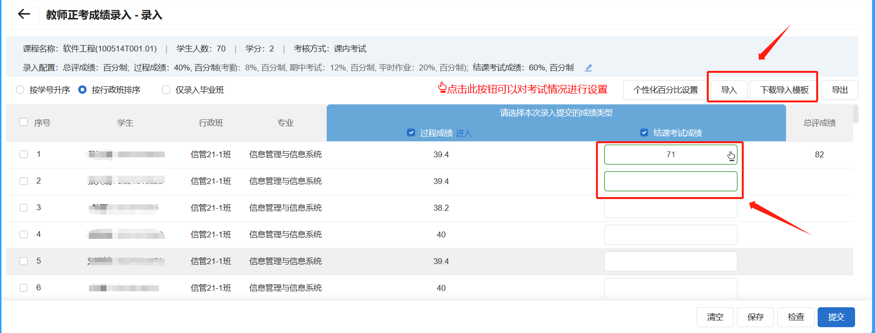 (2)模板导入:可以点击右上角的下载导入模板,成绩填入模板后,点击导入上传即可。