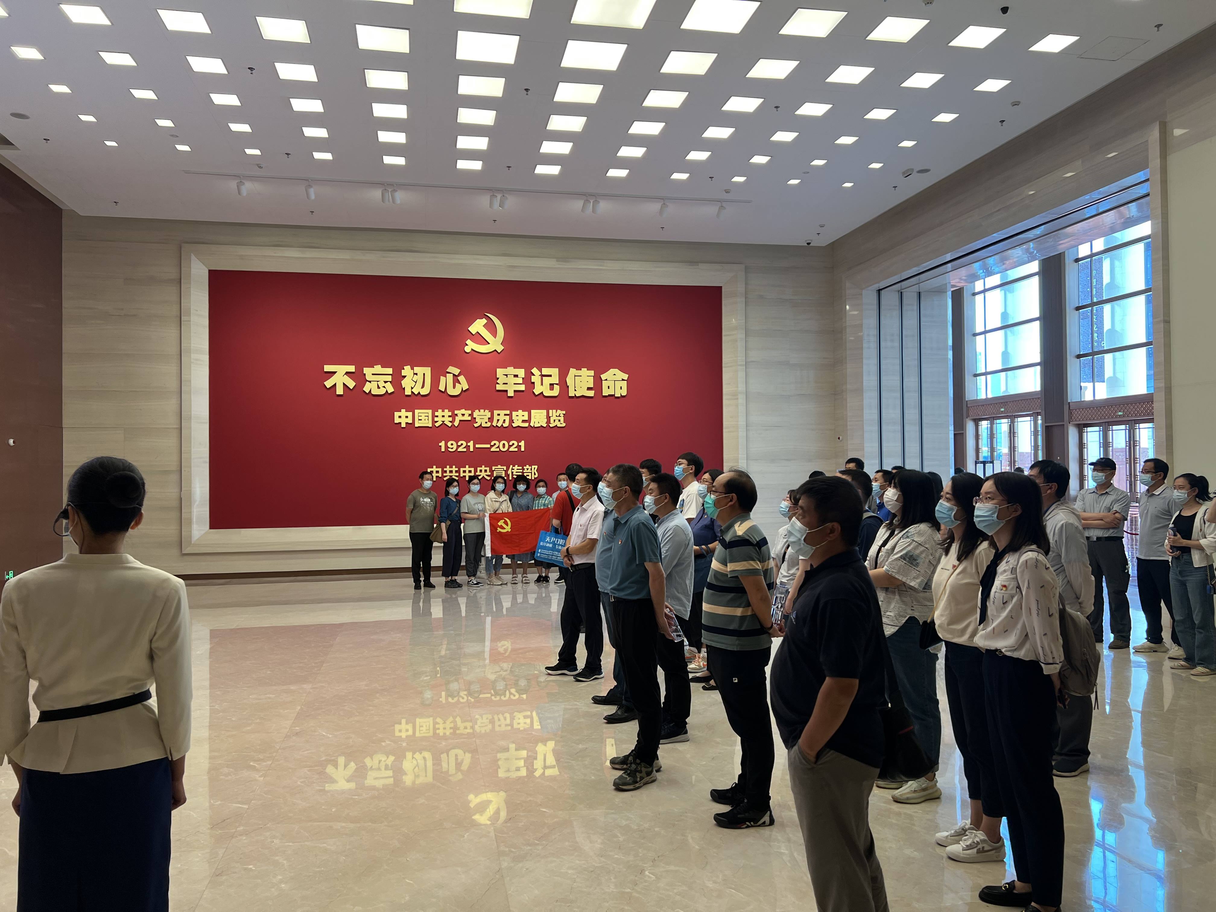 参观行程的最后,由9月份即将转正的党员黄山领誓、其他党员共同宣誓的仪式,在党史馆宣誓大厅庄重进行。全体党员面向鲜艳的中国共产党党旗,郑重举起右拳,重温入党誓词。大家以坚定有力的宣誓声,表达不忘初心、砥砺奋进的信念及决心。
