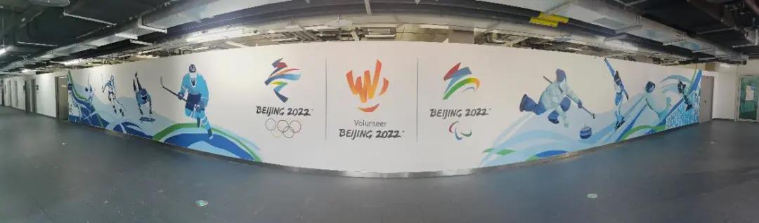 北京理工大学学生绘制完成了长达20米的墙绘作品《逐梦冰雪,相约冬奥》,以北京2022年冬奥会和冬残奥会会徽以及赛事志愿者联合标志展开,以描绘各类比赛项目为主,通过柔和的曲线呈现首钢滑雪大跳台的优美和飞跃的形象,让志愿者之家更具特色。