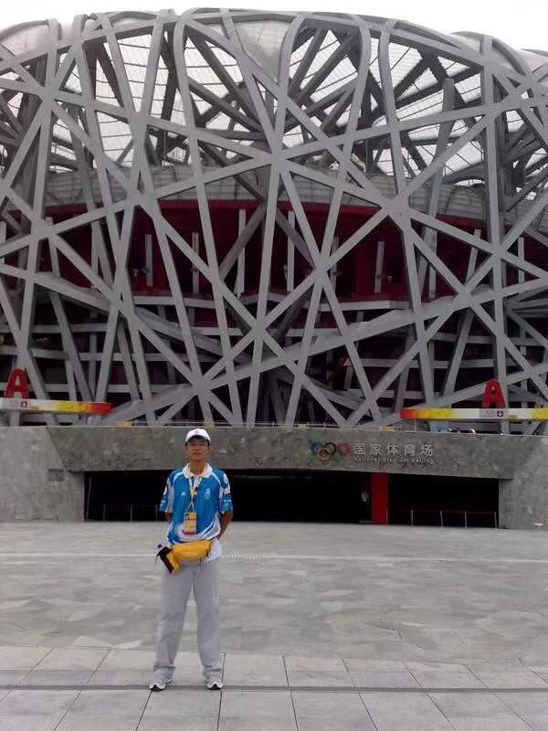 2008年,王天完成奥运志愿服务任务后,在“鸟巢”外留影