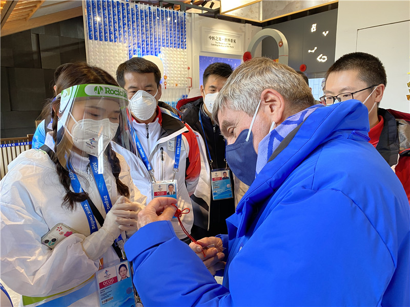 2月11日,国际奥委会主席巴赫来到延庆冬奥村,在与高校赛会志愿者交流过程中,收获了志愿者亲手编织的中国结,还特意去“10秒”中医药体验馆“打卡”了中国功夫五禽戏,珍藏了志愿者赠送的绘有老虎形象的五禽戏书签。此外,在国家高山滑雪中心,巴赫主席还获赠了志愿者设计的红色虎头剪纸。