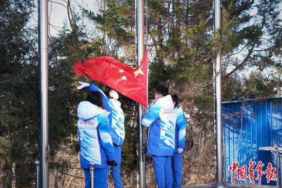 大年初一当天,北京冬奥会延庆赛区志愿者驻地举行升国旗仪式。中青报·中青网见习记者 尹希宁/摄