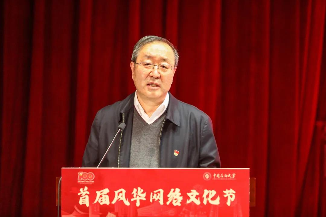 针对学校网络文化工作及校园文化建设,他提出三点要求。一是提高思想站位,重视网络文化。要运用新媒体新技术使工作活起来,推动思想政治工作传统优势同信息技术高度、深度融合,把好方向,主导网络文化建设的流向和流量,传承弘扬中华优秀传统文化、革命文化和社会主义先进文化,推进提升中石大精神文化的凝聚力、影响力、传播力、创造力。要把风华网络文化节建设成为深化网络思想政治教育的重要载体,加强人文关怀和心理疏导的重要平台,培育自尊自信、理性平和、积极向上社会心态的重要力量,发挥好思想上解惑、精神上解忧、文化上解渴、心理上解压的重要作用,使互联网这个最大变量变成事业发展的最大增量。二是优化内容供给,繁荣网络文化。在出好作品、出精品、出师生喜闻乐见的网络“爆款”上下功夫,以好的作品影响师生精神世界,引发思想共鸣,凝聚行动力量。要坚持内容为王、提高品质、创新载体,努力创作生产更多符合社会主义核心价值观、体现学校刚健鲜明的文化精神、反映正确审美追求的优秀作品和活动,以高质量的文化供给增强师生的文化获得感、幸福感。三是坚持守正创新,建强网络文化。在基础性、战略性工作上下功夫,在关键处、要害处下功夫,在工作质量和水平上下功夫,加强组织统筹、阵地建设管理、网络文化队伍建设,推动方方面面齐动手,各类群体齐努力,让网络文化建设的思路“明”起来、举措“实”起来、成效“稳”下去。