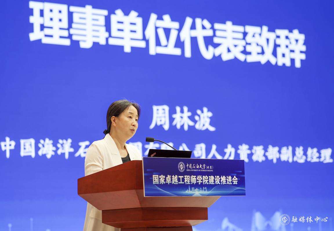 中国海洋石油集团有限公司(以下简称“中国海油”)人力资源部副总经理周林波代表理事单位致辞。她强调了建设国家卓越工程师学院的战略意义,表明了中国海油及兄弟企业与中石大深度融合落实工程硕博士联合培养工作的决心。她表示,中国海油将以支撑高水平科技自立自强为导向,紧扣国家战略需求,发挥产业优势,坚持科研、生产、人才培养一体化,提升自主培养能力,建设高素质人才培养体系,为国家能源安全和民族复兴提供人才保障。