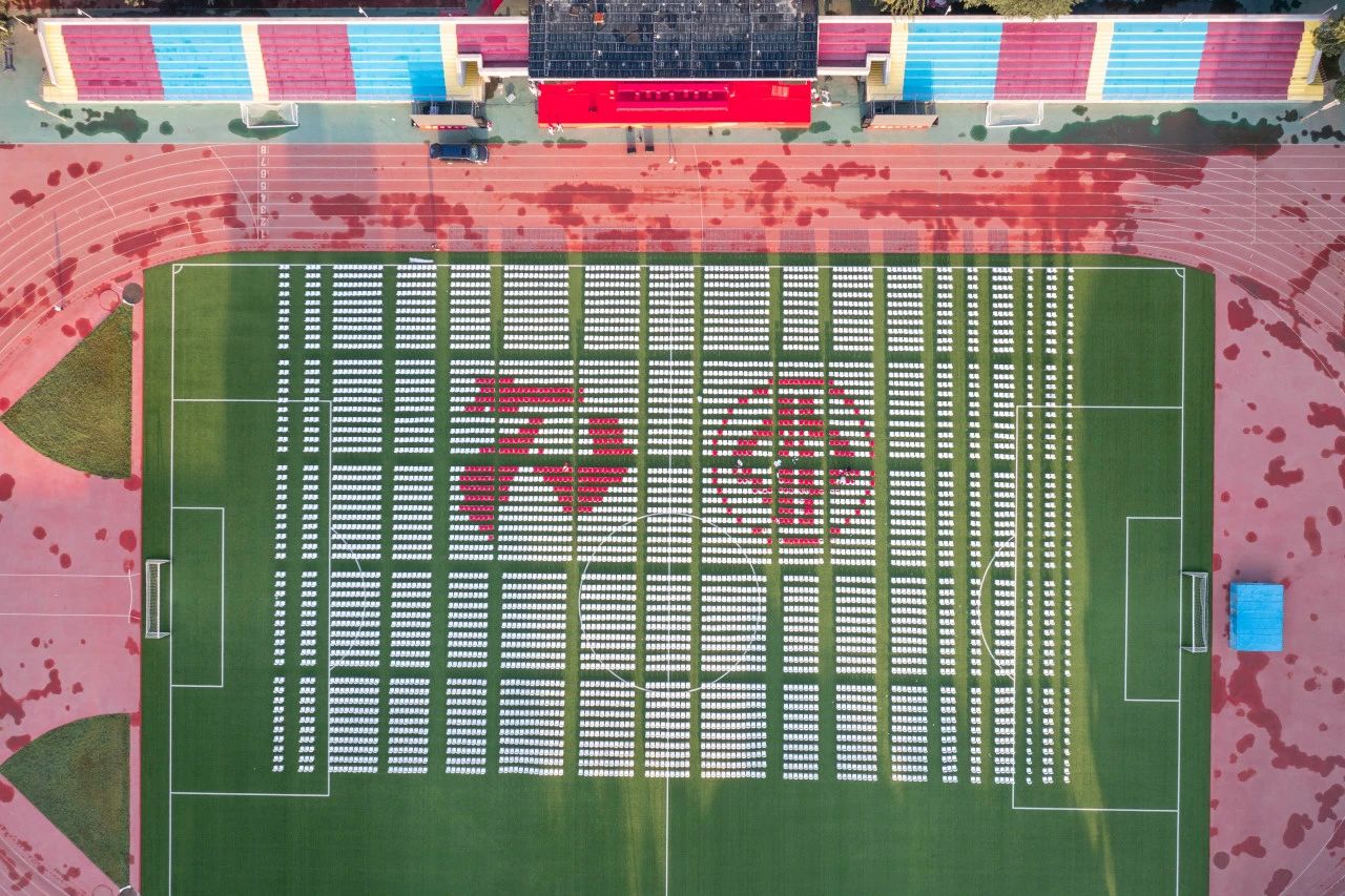 红旗操场主席台上,写有校风“实事求是、艰苦奋斗”、校训“厚积薄发、开物成务”的背景板格外醒目,主席台两侧的大屏上播放着校园风光和新生报到的视频。典礼现场,2023级新生容光焕发,整齐就坐,座椅摆出校徽和“70”的造型,现场氛围浓厚热烈。