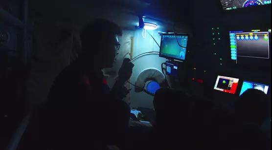 为了节省潜器电力,在下潜过程中,“深海勇士号”载人深潜器是不开灯的。经过近一个小时的下潜,“深海勇士号”终于下潜到了水下1500米的目标位置附近,通过坐标确定目标方位后开始了紧张有序的观测工作。