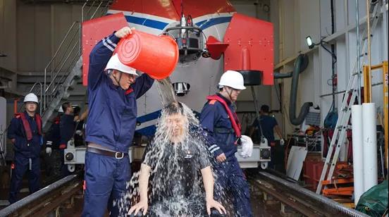 航次首席科学家、中国科学院深海科学与工程研究所王大伟教授为凯旋归来的杨进教授举行了浇水礼。浇水礼是载人深潜界的一个传统:即每一个新下潜的人员,在突破他们个人深潜纪录的时候,都将进行一次浇水礼。