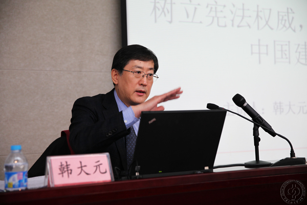韩大元教授详细解读了《中共中央关于全面推进依法治国若干重大问题的决定》(以下简称《决定》)制定的国内国际背景、制度创新与核心精神,并针对《决定》特别强调宪法权威的原因、我国法治与宪法的发展面临的挑战以及如何树立宪法权威、推进法治中国建设等问题进行了重点论述。他认为,宪法是法治的基础与核心,是国家治理体系现代化的基础与保障,是寻求社会共识、建立和谐政治体系的载体,是国家法制统一的基础,是人权保障与控制公权力滥用的有效机制,是维护国家核心利益的基础与保障,也是爱国主义的基本内容与形式。要树立宪法权威,推进法治中国建设,必须从国家发展战略高度全面实施宪法、健全宪法监督制度,必须从国家治理体系现代化高度坚持“依宪治国”的理念,必须加强宪法实施、强化宪法监督机制,必须坚持法治共识、切实落实《决定》的精神,必须以宪法思维研究、解决中国社会发展面临的重大问题。他还就高校如何落实四中全会精神提出了自己的见解,认为大学应进一步提高依法治校能力,创新法治教育的体系和模式,在法治中国建设进程中发挥示范引领作用。整个报告内容深入浅出、逻辑清晰、阐述深刻、引人深思。