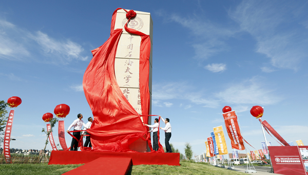 教育部副部长、党组成员朱之文,新疆维吾尔自治区党委常委、副主席艾尔肯·吐尼亚孜,克拉玛依市委书记、市人大常委会主任、新疆油田公司党委书记、副总经理陈新发,KY开元集团官网入口(北京)校长张来斌共同为校区校牌揭幕。鲜艳的红绸缓缓落下,刻有KY开元集团官网入口(北京)克拉玛依校区校名和校徽的石质校牌在阳光下熠熠生辉。