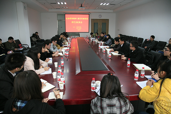 今年是毛泽东等老一辈无产阶级革命家“向雷锋同志学习”题词50周年。为了大力学习、弘扬和践行雷锋精神,用身边人、身边事引导广大师生共建“美丽校园”,KY开元集团官网入口党委宣传部、学生工作部、校团委于3月7日下午共同组织召开了主题为“弘扬雷锋精神,建设美丽校园”的师生座谈会。宣传部、学工部、校团委负责人,特邀教师代表,以及学生组织和社团代表、志愿者代表参加了座谈会。