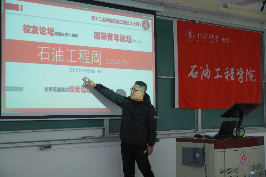 石油工程学院党委书记黄世军,党委副书记刘东东,团委书记肖亚楠,油藏数值模拟第一党支部思想导师贾品、第二党支部思想导师薛永超,辅导员李杰,第九届设计大赛油藏工程单项组全国一等奖获得者贾志豪、方案设计类综合组全国一等奖获得者李培宇以及16个分赛区的400余名参赛选手参加活动。