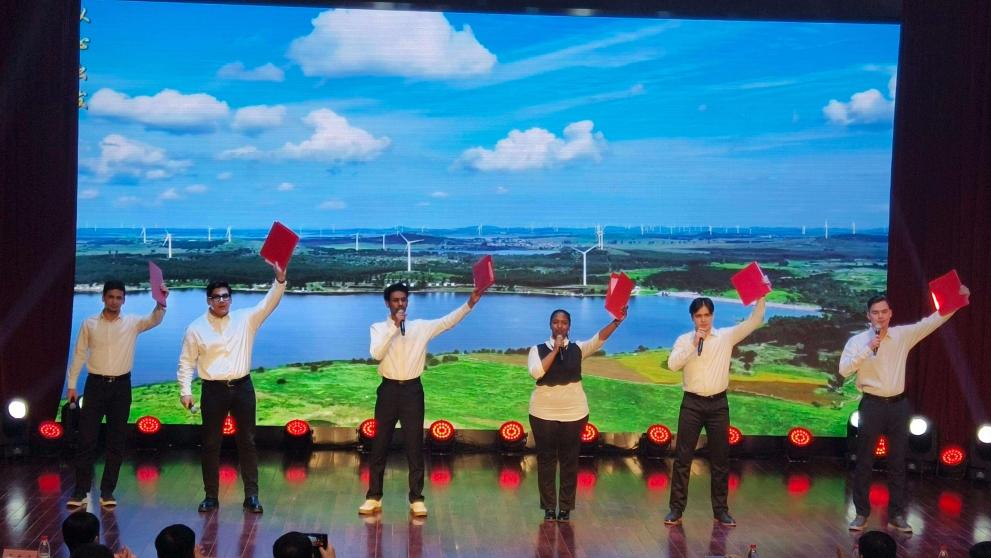 随后,活动现场播放纪录片《彰武治沙》,展现彰武从沙海荒漠到万亩松林的蜕变历程,通过影像呈现一代代治沙人向沙海宣战的场景。纪录片播放结束后,彰武治沙学校演职人员身着工装上演情景剧,复刻治沙先辈风餐露宿、与沙抗争的历程,包括栽种树苗、攻克沙化困境、见证树苗成活等场景,以具体人物故事诠释治沙精神。彰武县宣讲团还邀请6名国际学生代表,以诗朗诵形式总结治沙成就与精神价值,以亲身参与,感受彰武人“矢志不移、甘于奉献”的治沙精神,向新一代青年发出保护环境的中石大倡议。
