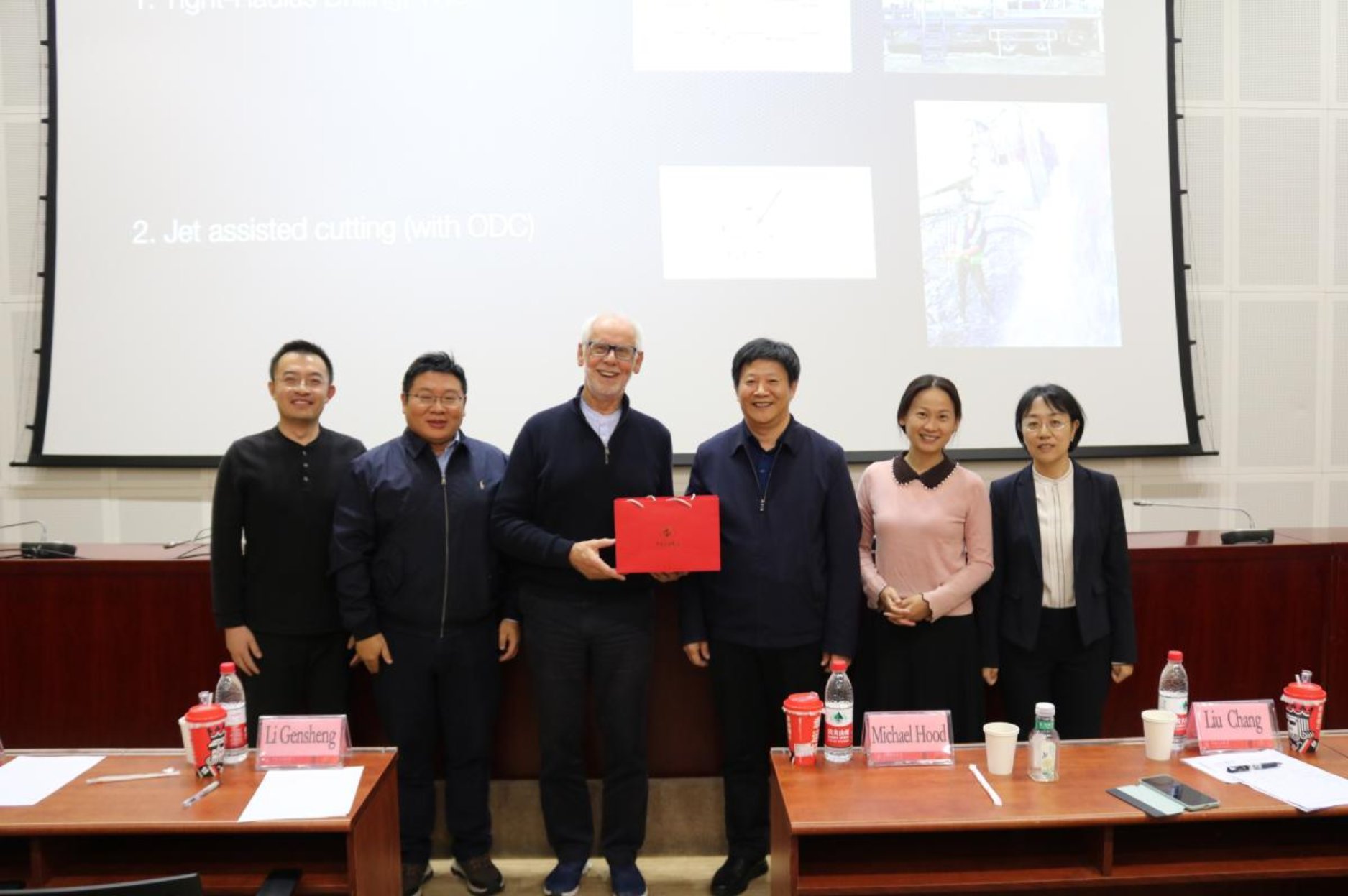 报告结束后,Michael Hood与在场师生进行了互动交流,围绕TRD技术应用成本与效率、安全与维护、发展前景,以及CCS与DAC技术成熟度和成本、应用范围与潜力等方面展开深入探讨。李根生院士表示,本次报告会不仅为师生们带来了前沿的学术知识,也为学校在相关领域的发展注入了新的活力,为未来的学科合作和人才培养奠定了良好的基础。会后,李根生院士向Michael Hood赠送中石大纪念礼品并合影留念。