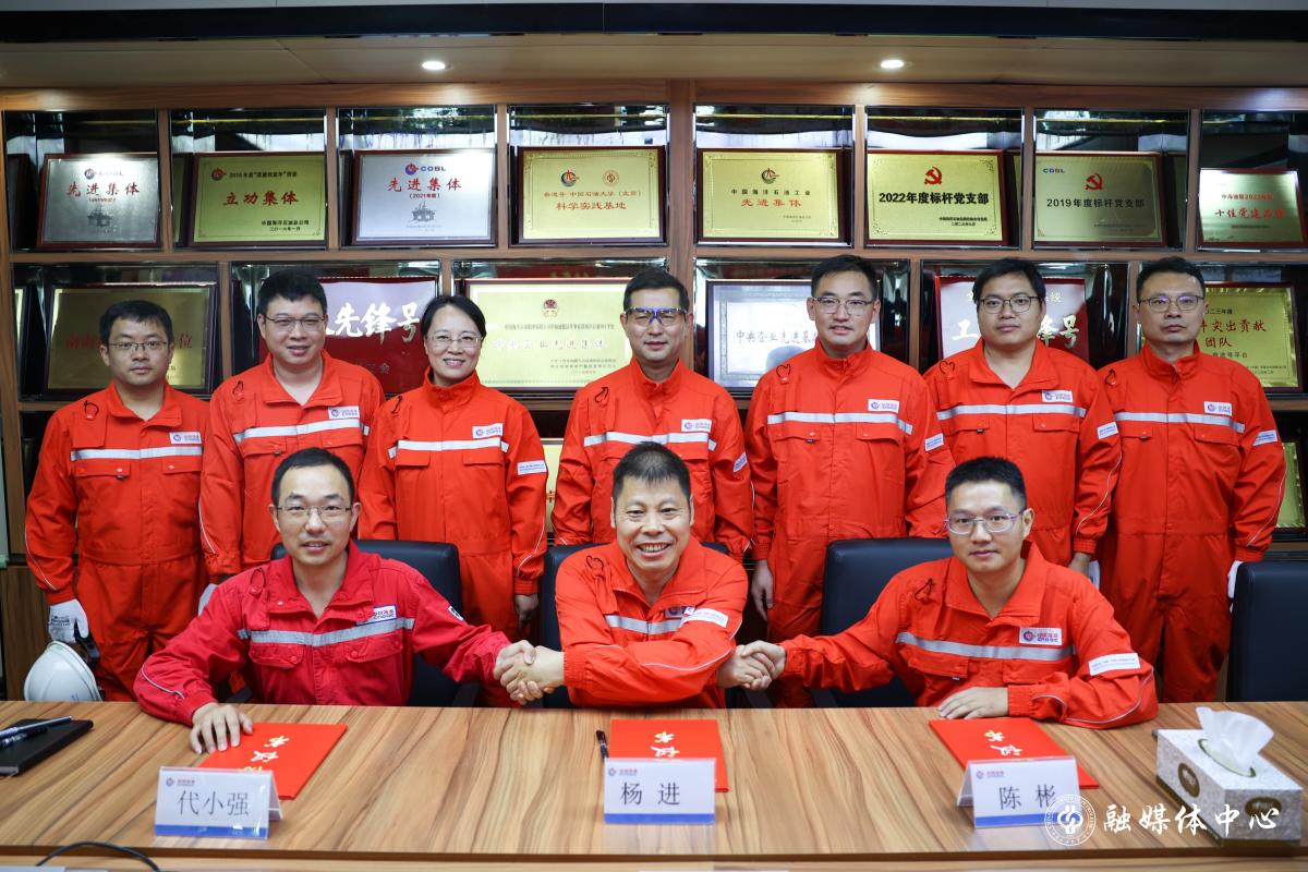 中石大深海工程团队党支部书记杨进与陈彬、代小强作为三个党支部的代表,共同签署党建共建合作协议。