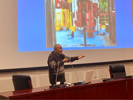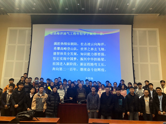 在三个多小时的演讲中,方华灿运用大量的资料、工程现场图片和详实的数据,充分阐述了新型“四化”钻机、多功能双壁钻杆、智能采油的纳米驱油、采油井井下分离和未来发展的智能油田等石油工程领域世界领先的技术成果和前沿知识。最后,方华灿朗诵寄语海洋油气工程年轻学子的诗赋,激励青年学子投身海洋石油行业,到海上、到基层去、到祖国最需要的地方去。