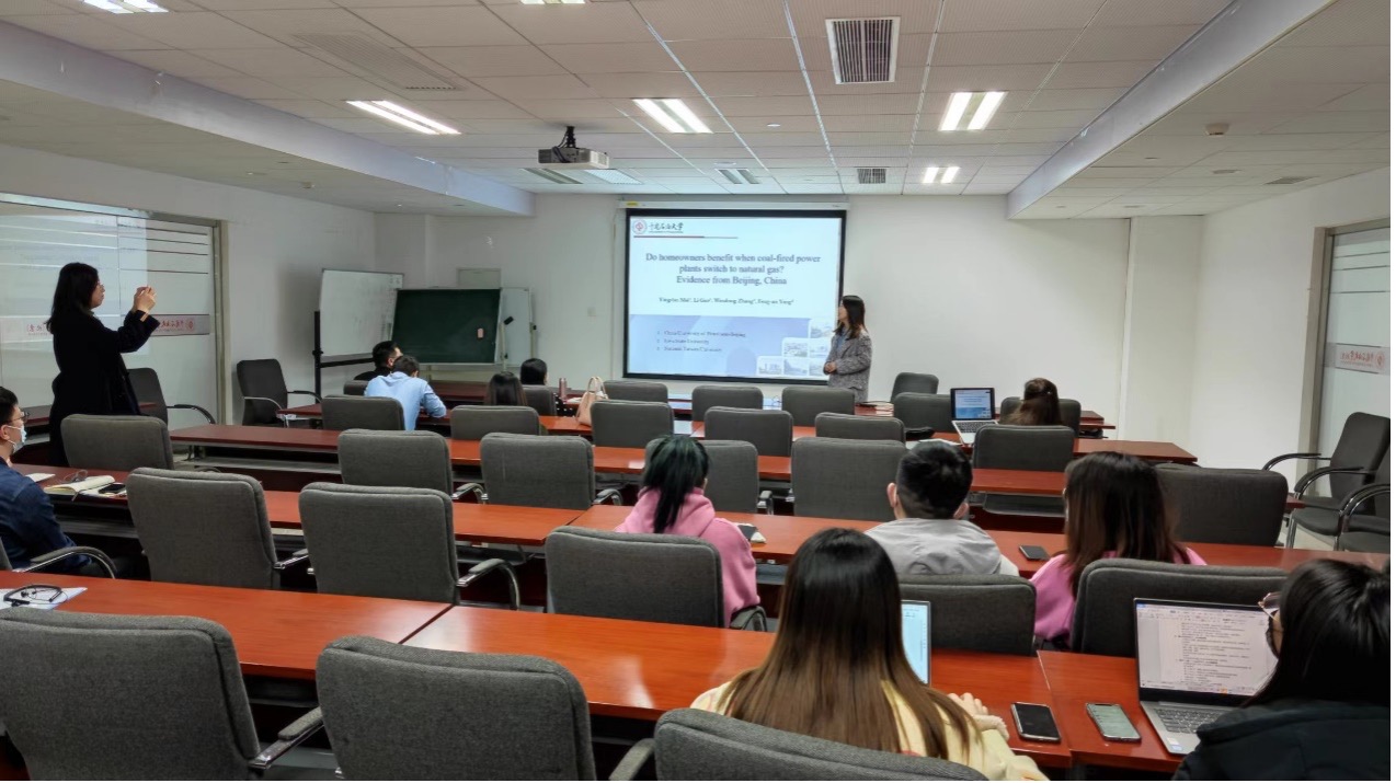 梅老师的论文首次对火电厂“煤改气”的环境和经济效益进行了因果关系的识别。基于2011年到2015年北京市房地产交易大数据和北京市火电厂“煤改气”信息,论文首先采用半参数估计方法精确识别了电厂对周边房屋的影响边界,并利用三重差分(Triple Differences)模型,即燃煤电厂与“煤改气”电厂(control versus treat)、靠近电厂与远离电厂(near versus far)、“煤改气”政策前与政策后(pre versus post)的三个层面对比,有利地克服了现有政策分析中普遍存在的因趋势不一致导致的遗漏变量问题。此外,梅老师还分享了论文写作之外的经验,诸如合作者的选择、数据的获取与处理、选题心得、研究构思与方案设计等。特别是,她讲述了从选题到发表的4年里发生在论文背后的故事,让人真切地感受到从成文,到退稿,再到反复打磨和一次次修改,直到最终录用的过程中,她所经历的艰辛,到场师生深受鼓舞和启发。参会师生与梅应丹老师就讲座内容等进行了广泛的交流和讨论,现场气氛十分热烈。