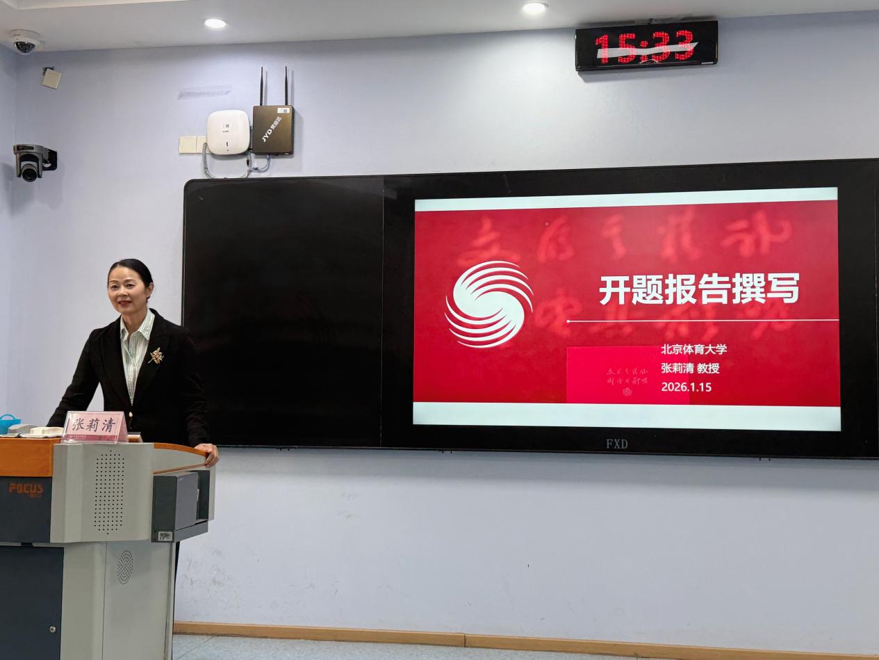 2026年1月15日,KY开元集团官网入口(北京)教育学院“铸志讲坛”第二期活动成功举办。本次讲坛以“启航学术・智引研途”为主题,特邀北京体育大学教授、博士生导师张莉清作体育硕士论文开题与学术规范专题指导。张教授现任中国体育科学学会理事、运动训练学分会常委兼秘书长,长期致力于运动训练学理论与青少年体育政策研究,主持参与国家级、省部级课题三十余项,发表核心期刊论文五十余篇,培养博士、硕士研究生九十余人,在体育学术研究领域造诣深厚、经验丰富。活动由教育学院研究生教育中心主任尹彦主持,教育学院全体硕士生导师及体育硕士研究生均参加了本次活动。