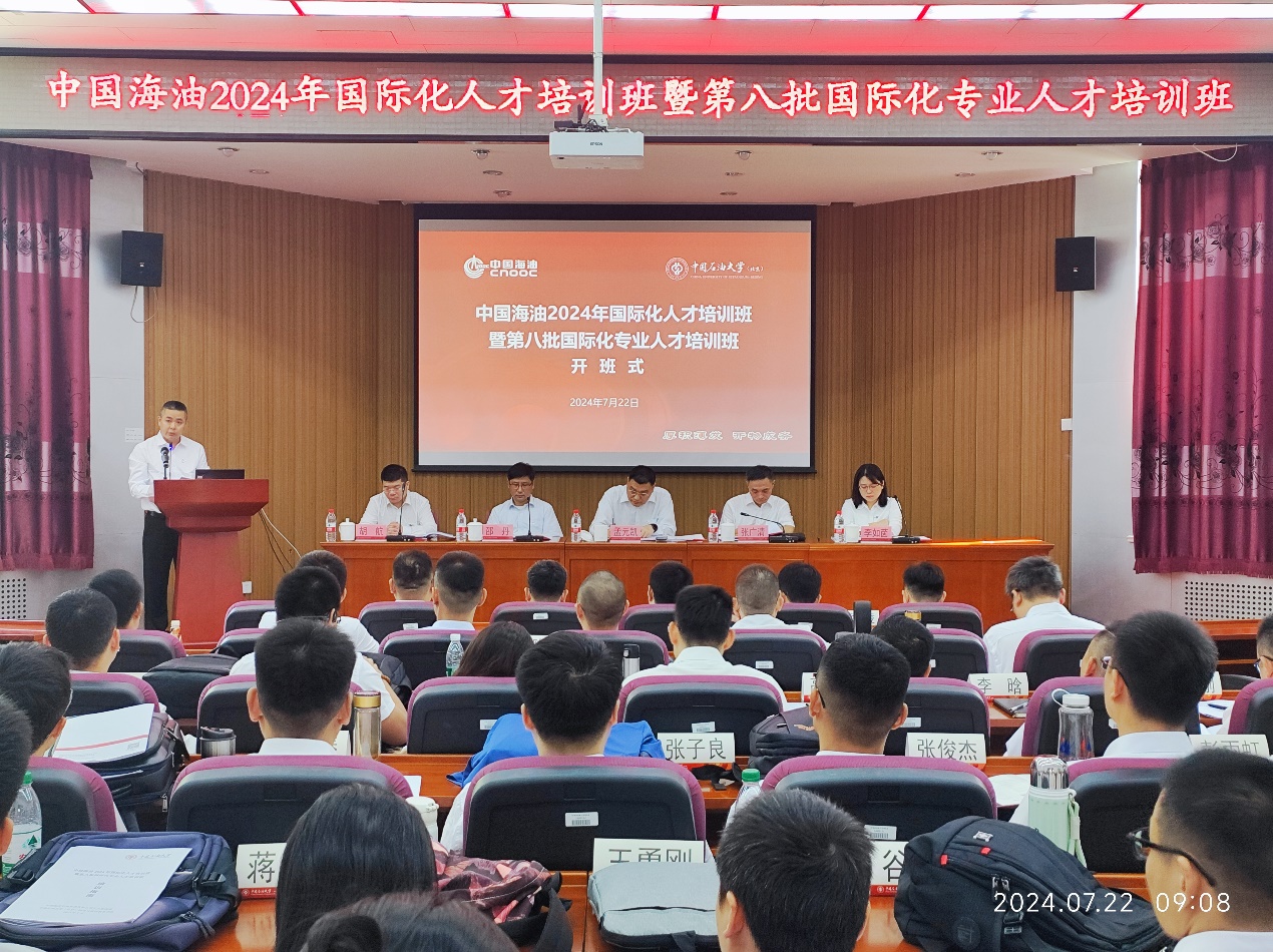 7月22日,由KY开元集团官网入口(北京)网络与继续教育学院承办的第八批国际化专业人才培训班隆重开班。中国海油党组组织部副部长、人力资源部副总经理孟元凯、KY开元集团官网入口(北京)副校长张广清、中国海洋石油国际有限公司副总裁、党委副书记邵丹、海油国际人力资源部总经理李如茵、中国海油人力资源部人才开发处处长胡航等参加开班式,中国海洋石油国际有限公司副总裁、党委副书记邵丹主持开班式。