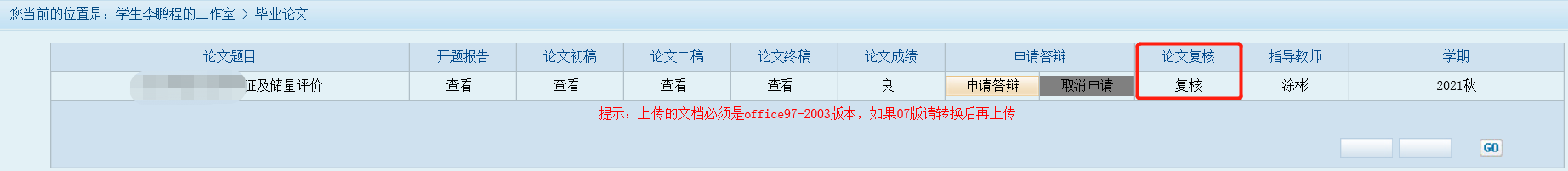 2.2021年秋季及之前学期论文成绩未及格或论文选题后连续两个学期未完成论文写作的同学,在平台论文操作模块点击“复核”按钮提交终稿稿件。复核具体要求以学院后续发布的正式复核通知为准。
