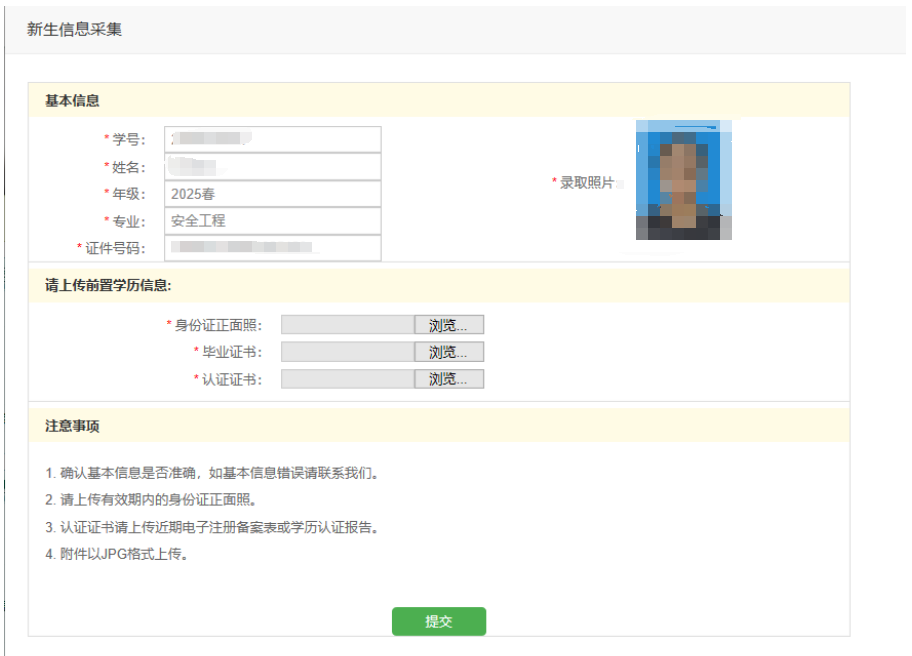 审核个人基本信息是否正确(姓名、身份证号、专业、照片等)。同时提交身份证正面照片、毕业证书照片、认证证书照片(学信网上的电子注册备案表或者学历认证报告),照片大小要求小于200k。