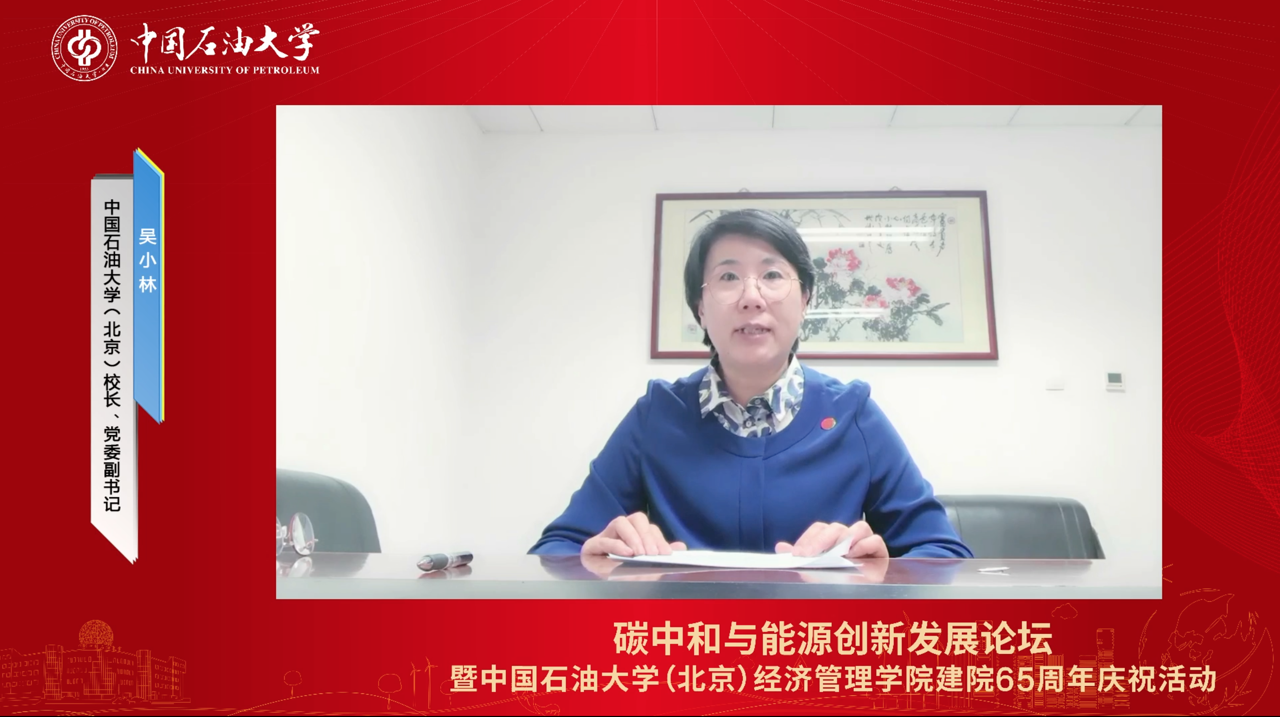 吴小林在开幕词中代表学校对参会嘉宾表示热烈欢迎。她指出,能源行业正处于转型变革的关键时期,高等教育肩负着支撑新的能源革命的时代使命。中石大作为能源行业领军高校,顺应能源转型大势和国家战略需求,聚焦碳减排、碳零排、碳负排的工程技术难题,加快培养面向能源前沿领域的交叉复合型创新人才。经济管理学院作为学校新一轮“双一流”建设的重要支撑力量,围绕服务学校发展目标,先后增设“能源系统与碳管理”二级学科,成立碳中和与能源创新发展研究院,积极探索碳中和与能源创新发展领域的高校特色智库建设。希望学院以此为契机,为学校建设能源领域世界一流研究型大学注入新的活力动能,在服务国家“双碳”目标、推进能源行业创新发展中展现新的贡献作为。