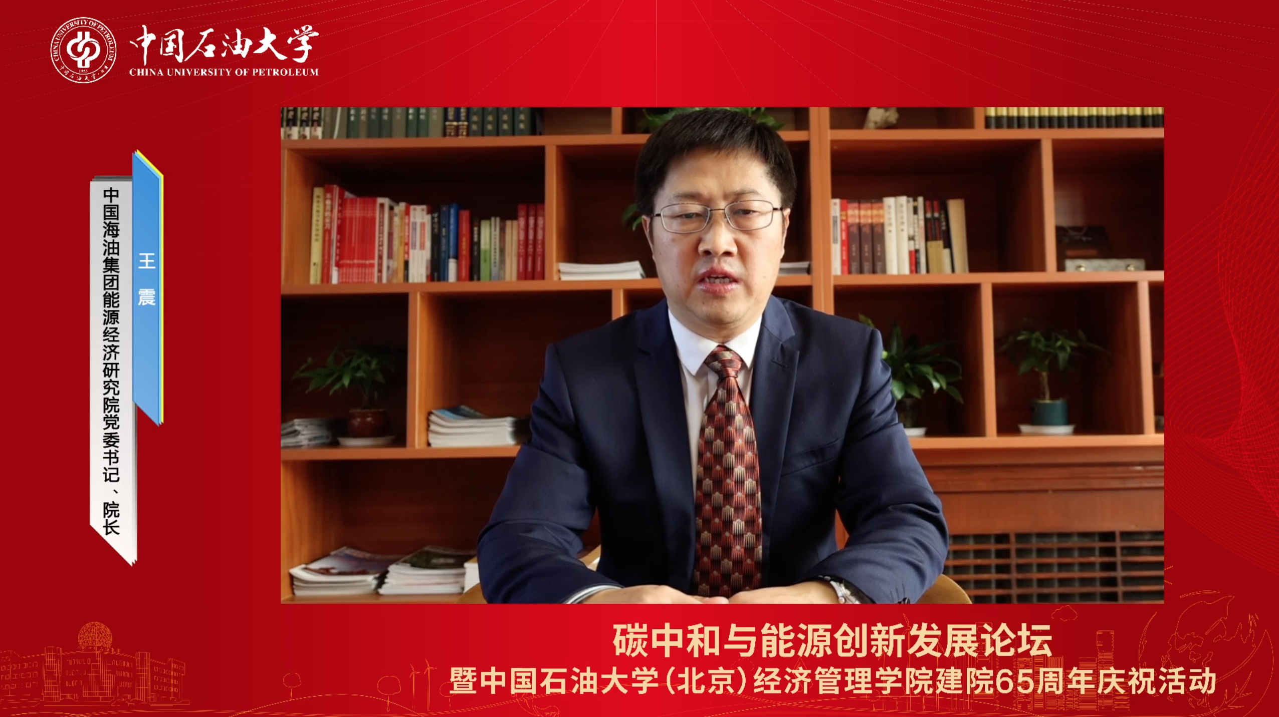 王震作为校友代表致辞,对学院建立65周年表示热烈祝贺。他重温了自己在经济管理学院求学、任教等难忘经历,回顾了学院发展的三个历史阶段以及孕育的三种精神,希望学院教师以学生全面发展为己任,坚持求真探索的科学家精神,服务能源行业和国家重大需求。